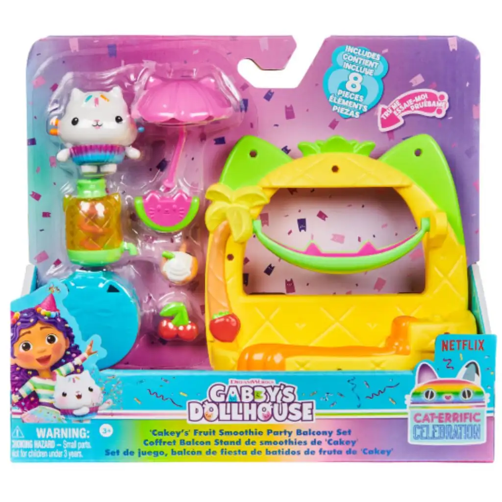 Fedezd fel Gabi babaházának varázslatos világát, és élvezd a közös játék minden pillanatát Cakey Cat-tel és barátaival a gyümölcsturmix parti erkélyén!