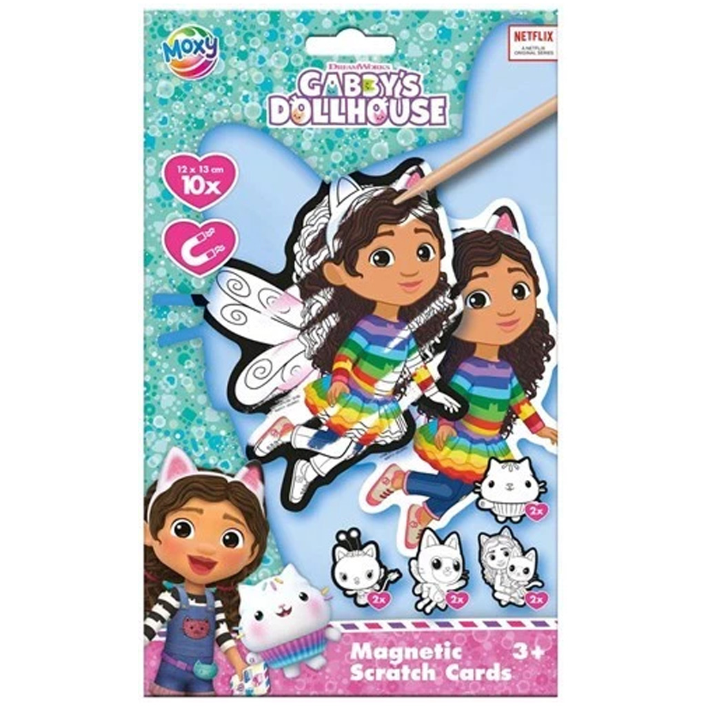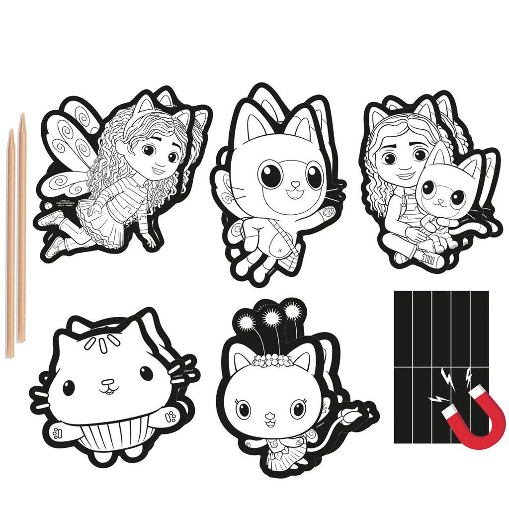 A szett 10 darab, fekete felületű karcolófigurát tartalmaz, amelyek alatt színes minták rejtőznek. A gyerekek a mellékelt fa karcolópálcával fokozatosan „felfedezhetik” a rajzokat, és így saját maguk hozhatják létre a kedvenc karaktereiket ábrázoló, egyedi díszeket. A szereplők között ott van természetesen Gabi, Pandy Paws, Cicalány Muffin, és még sok más cuki lakó a babaházból.