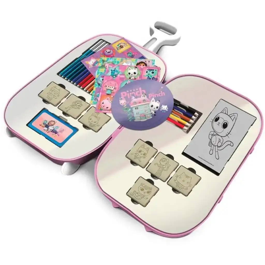 Fedezd fel a kreatív szórakozás világát a Gabi babaháza nyomdaszettel! Ez az aranyos, bőrönd formájú készlet tökéletes választás minden kis művész számára, akik rajonganak Gabi babaházának világáért. A bőröndben minden megtalálható, amire a kicsiknek szükségük van: színes ceruzák, nyomdák és egy rajztömb, így bárhol és bármikor szabadon alkothatnak. A könnyen hordozható bőrönd kerekekkel és fogantyúval rendelkezik, így a gyerekek magukkal vihetik bárhová – legyen az egy kirándulás, látogatás a nagyszülőknél, vagy egy kreatív délután a parkban.