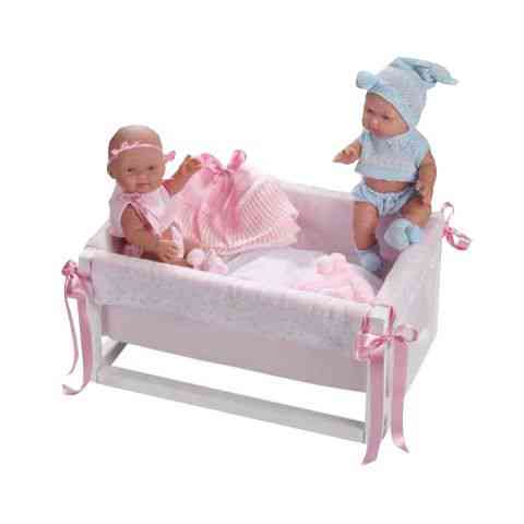 A különlegessége ennek a Llorens babának, hogy nem egy babát, hanem ikerpárt rejt a doboz. A két játékbaba egyike lány, a másik fiú, mely nem csupán a ruházaton látszik, hanem a baba testének külsején is. Az ikerpár játék baba tartozéka a műanyag keretes, textilből készült játékbölcső, melynek anyaga könnyen kezelhető, mosható textilből készült. A babák ruházata hurkolt anyagból van, mindkettőjüknek ruházata pom-pomos zokniból, kisnadrágól és rékliből, pom-pomos sapkából áll. Ezek színei a nemeknek megfelelőek. A bölcsőben egy vastag párna és egy puha, rózsaszín takaró van, melyek szintén könnyen kezelhető anyagból készültek. A babák további tartozéka a cumi, cumilánccal.