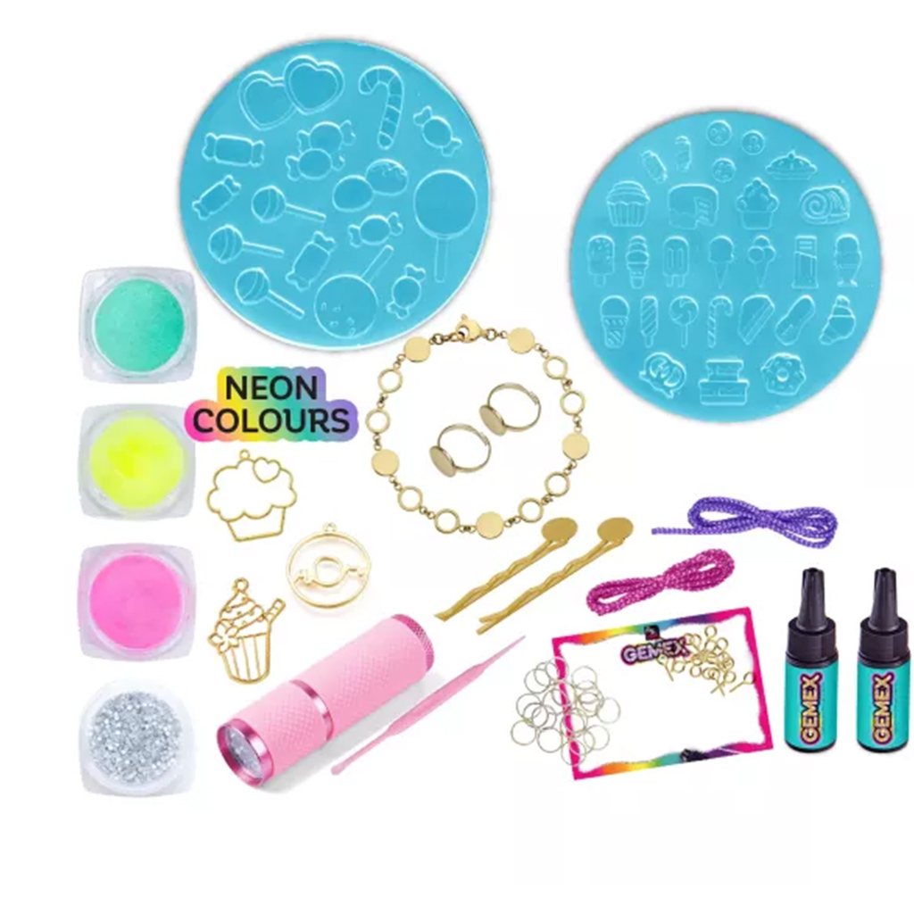 A készlet segítségével a gyerekek saját ékszereket készíthetnek, mint például gyűrűket, karkötőket, hajcsatokat vagy medálokat, méghozzá neon színű zselék és csillámpor kombinálásával. A különböző édességformájú öntőformák – fánkok, nyalókák, muffinok – garantáltan elnyerik minden kis alkotó szívét. A gélbe kevert csillámporral még látványosabbá tehető a végeredmény, a mellékelt UV lámpa pedig pillanatok alatt megszilárdítja a gélből készült formákat.