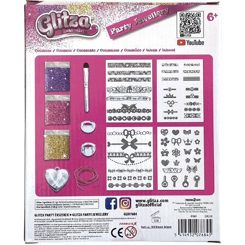 A Glitza Party ékszerek csillámtetkó szettben gyermeked minden olyan kiegészítőt és díszítő eszközt megtalálhat, amely egy hatalmas parti során szükséges lehet a divatos megjelenéshez. A csomag három különböző színű csillámport tartalmaz amelyeket a matricák felhasználásával egy szempillantás alatt akár a bőrére, vagy a szettben található ékszerekre hordhat fel. Használata rendkívül egyszerű, a matrica íven található motívumok közül válaszd ki azt, amely gyermeked számára a leginkább tetszik, vágd körbe majd ragaszd fel arra a felületre, ahová szánod. Miután a védőréteg fóliát lehúztad róla, az ecset segítségével elkezdheted felhordani a csillámport amely azonnal hozzátapad és megszárad.