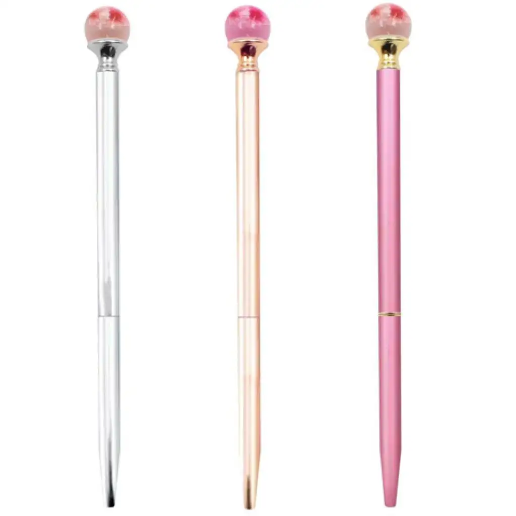 Egy szuper golyóstollat szerezhetsz be gyermeked vagy magad számára, mely elsőre elnyeri majd a tetszéseteket. A golyóstollak ugyanis különleges megjelenést kaptak. A végeiken egy üveggolyó található. melyek belsejében szárított virágok láthatók, melyek csodaszépen mutatnak. A golyóstollak ráadásul háromféle különböző színben érhetőek el, melyek között rózsaszín, rosegold és ezüst színeket találsz, így kiválaszthatod, melyik tetszik a leginkább. A tollak alsó részét eltekerve lehet bekapcsolni, így már lehet is írni vele. A tollak hegyével vékony vonalakat lehet húzni, így remekül lehet hasznosítani akár iskolában vagy munkában de akár otthon is.