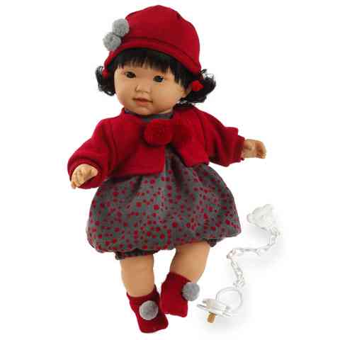 A baba ázsiai vonásai miatt különleges. Ruházatának markáns, piros színe dinamikussá, figyelem felkeltővé teszi a játékot. A baba pom-pomos, piros kardigánjának, szintén piros, pom-pomos sapkájának, és zoknijának színét kellemesen töri meg a szürke, piros pettyes lányruha. Öltöztethető, sőt, fésülhető, haja copfozható.
