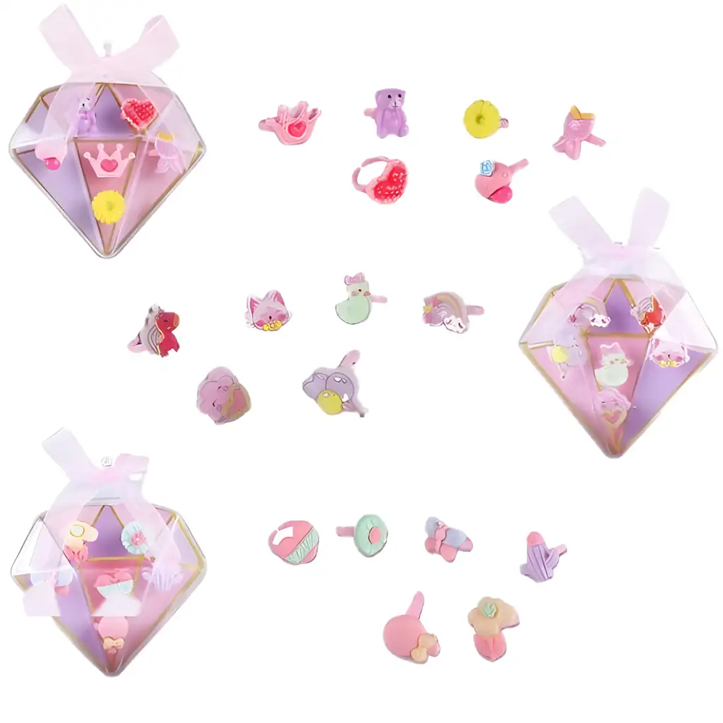 Az aranyos gyémánt alakú dobozban rejtőző rózsaszín gyűrű szett egy igazán különleges ajándék kislányok számára. A doboz egy rózsaszín szalaggal van díszítve, amely masnira van kötve, így már az első pillantásra is varázslatosnak tűnik. Amikor kinyitod a dobozt, egy gyűrű kollekció tárul eléd, melyek mindegyike egyedi szimbólumokkal van ellátva.