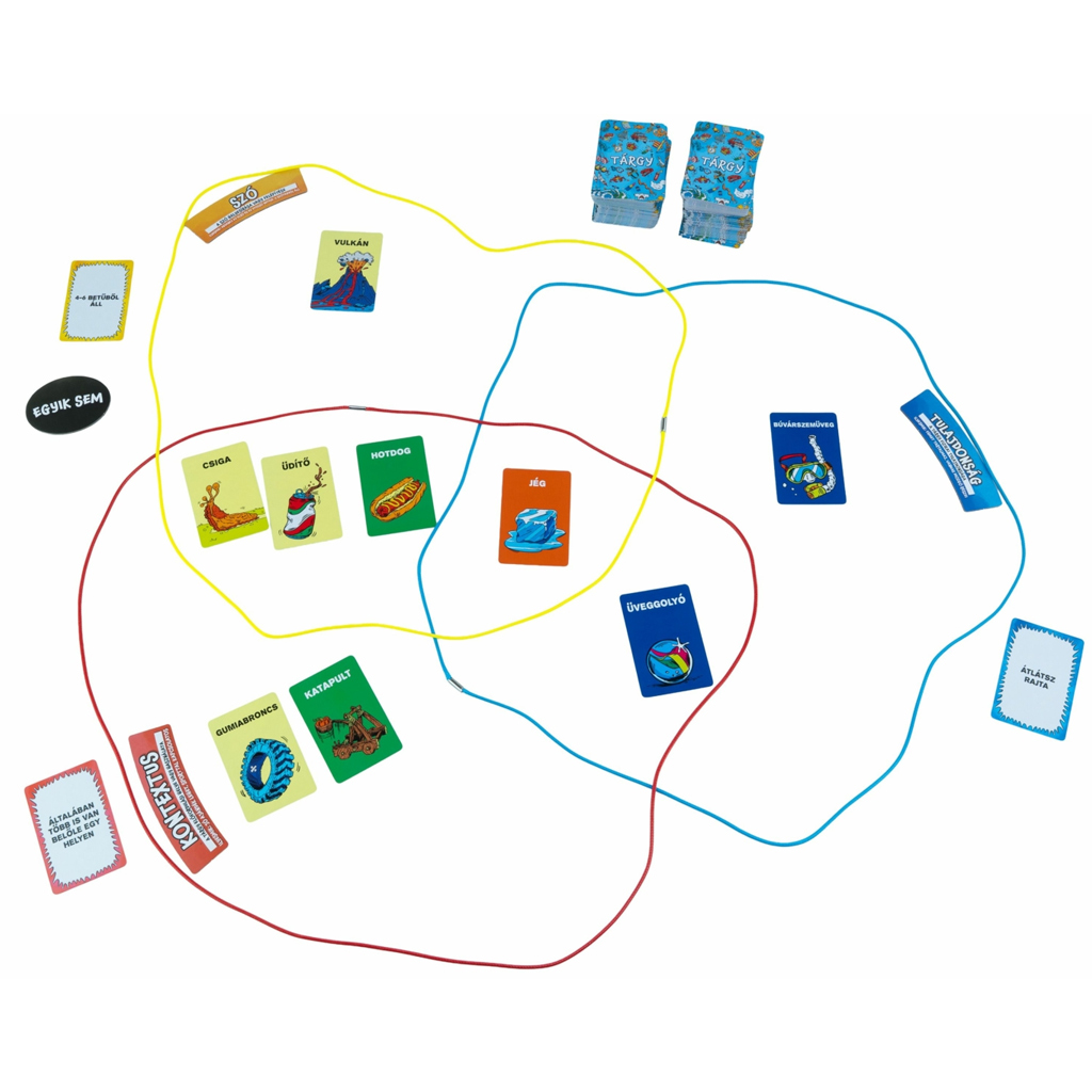 A Halmazállapot egy szellemes, színes és garantáltan nevetéssel teli partijáték, amelyben a kreativitás, az asszociációs készség és a logika kerül középpontba. A játék során három, színes karikával kijelölt halmaz áll rendelkezésedre, és az a cél, hogy kitaláld: vajon milyen szabály alapján kerültek bele az adott tárgyak? De vigyázz – a karikák átfedésben vannak, és az átfedések újabb, összetettebb szabályokat is rejthetnek!