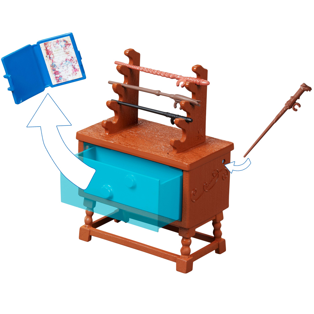 A szett 10 filmes ihletésű kiegészítőt tartalmaz: 4 különböző varázspálcát, egy patrónust, pennát, könyvet és további apró varázstárgyakat. A pult fiókja meglepetést rejt – akárcsak a varázsvilágban, itt sem minden az, aminek látszik! Vajon melyik pálca nyitja ki a fiókot? A részletgazdag kialakítás tökéletes kiegészítője lehet más Abszol út szetteknek is, így még teljesebb lehet a mágikus játékélmény.