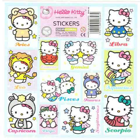 Az asztrológia és a Hello Kitty kedvelőknek aligha találni ennél jobb matricát, hiszen mindegyik csillagjegy megtalálható rajta, természetesen Hello Kitty stílusban az összes. Az íven tizenkettő darab matrica található, és mindegyiken a népszerű cica látható Vízöntő jegytől kezdve a Mérlegig bezárólag. A matricák természetesen előre körbe vannak vágva, így a gyerekeknek csak le kell szedni az ívről, és máris bárhova felragasztható. Az apró matricákkal egyszerűen jelölheti a saját játékait vagy iskolai felszerelését.
