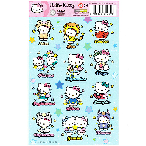 Ismerd meg a csillagjegyeket kedvenc kiscicáddal, Hello Kittyvel! A matricákon Hello Kitty mindig egy-egy csillagjegyet jelenít meg, így a Vízöntő, az Ikrek, a Skorpió vagy épp a Bika csillagjegy sajátosságait viseli magán a bájos cica. Dekoráld a matricákkal rajzaid vagy személyes tárgyaid, vagy készíts ajándékot vele ismerőseidnek - természetesen a saját csillagjegyükkel!