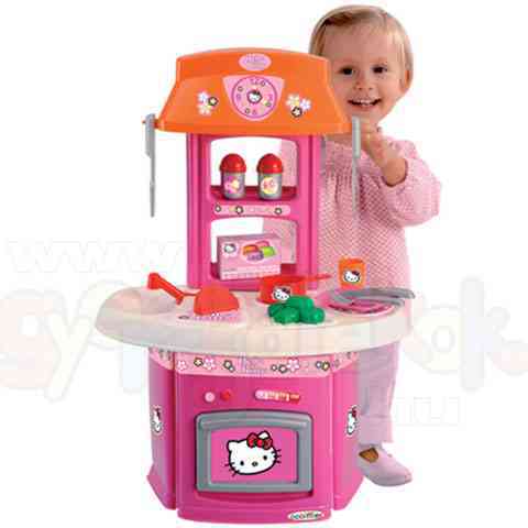 Színes Hello Kitty mintával díszített játékkonyha sok-sok kiegészítővel, nyitható sütőajtóval a legkisebbeknek. 60 cm magas.