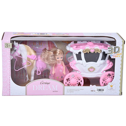 Szerezz be gyermeked játékgyűjteményébe egy hintó játékszettet amelyben egy 13cm-es hosszú szőkehajú baba és egy hófehér paripa is megtalálható. A baba rózsaszín ruhában érkezhet amely tökéletesen passzol a ló szintén pink színű nyeregéhez és kantárjához egyaránt. A fehér-pink színű hintóba a baba kényelmesen elhelyezhető és már kezdődhet is a játék. A hintó gördülékeny kerekei kiválóan alkalmasak közlekedésre, így gyermeked akár egy kitalált mesét is eljátszhat újdonsült játékszettje segítségével.