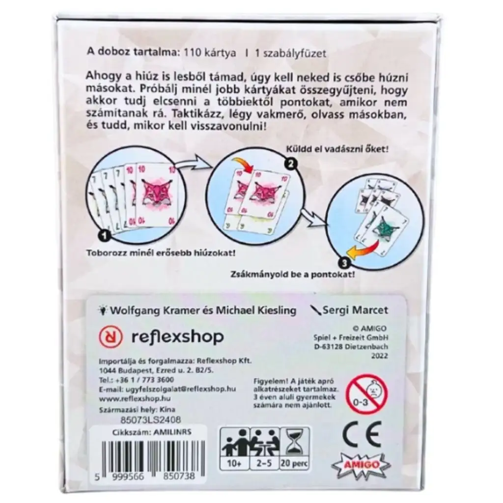 A Hiúzz egyet! egy szórakoztató, fordulatos kártyajáték, amelyben a stratégia és a lopás kerül a középpontba! A cél, hogy minél több kártyát gyűjts össze magad elé, mert ezek hozzák a pontokat. Azonban légy résen, mert a többiek bármikor elcsenhetik tőled ezeket a kártyákat, és akár a pontjaidat is! A játék egyszerű szabályai miatt könnyen tanulható, de a folyamatos rivalizálás miatt mindig izgalmas marad. Játszd ki a kezed okosan, lopj ügyesen, és szerezz annyi pontot, hogy te legyél a győztes. Tökéletes választás családi délutánokra és baráti összejövetelekre!