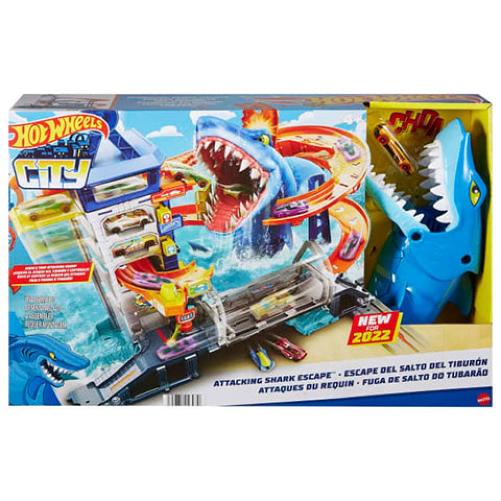 Kocsikázz végig a Hot Wheels parkolóházban, de vigyázz a veszélyes cápával, amely megtámadja és felfalja a gyanútlan járműveket! Menj fel a lifttel az épület tetejére, majd engedd el az autót minden szinten, ahol három aktivátor van, amelyek véletlenszerűen indítják el a cápát, hogy áttörjön és felfalja az autót. Surranj el a végére, és a cápa bezáródik a ketrecbe, így megnyílik a pálya a támadásmentes vezetéshez. Egy Hot Wheels járművet tartalmaz, de többnek is van parkolóhely. Csatlakoztasd más Hot Wheels készletekkel és pályadarabokkal, hogy egy egyedi városképet építs.