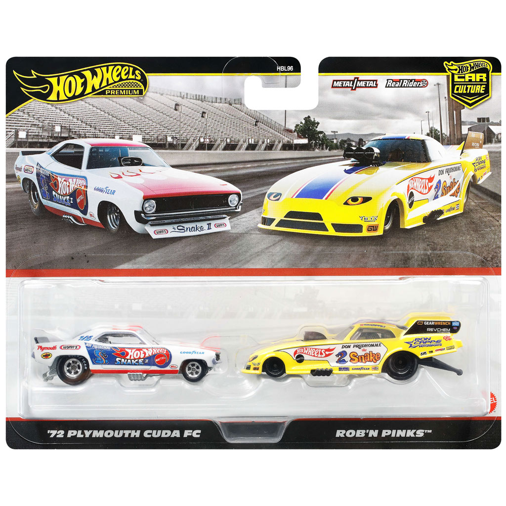A ’72-es Plymouth Cuda FC a klasszikus izomautók brutális erejét testesíti meg, míg a sárga Rob’n Pinks a modern versenyautók aerodinamikus dizájnját hozza el – együtt tökéletes párost alkotnak a polcon és a képzeletbeli pályán is.
