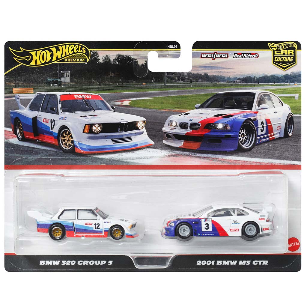 Ez a különleges Hot Wheels prémium kisautó csomag két legendás BMW versenyautót hoz el gyűjteményedbe, egyenesen a motorsport történelmének csúcsairól! A BMW 320 Group 5 és a 2001-es BMW M3 GTR egyaránt ikonikus szereplői a pályaversenyeknek, és most részletgazdag, 1/64 méretarányú modellként elevenednek meg. A BMW 320 Group 5 a 70-es évek agresszív szélesítéseivel és spoilereivel igazi versenypályás látványosság, míg a 2001-es M3 GTR a Le Mans legendája, amely technikai precizitásával és erőteljes megjelenésével vált ikonná. Mindkét modell a híres BMW Motorsport fehér-piros-kék dizájnt viseli, ami még látványosabbá teszi a szettet. A kisautók fém karosszériával és alvázzal, valamint gumiból készült Real Riders gumikerekekkel rendelkeznek, ami nemcsak élethű megjelenést, hanem tartósságot is biztosít. A szett gyűjtőknek és kisautó-rajongóknak is ideális választás, hiszen két különböző korszak klasszikusai találkoznak benne.