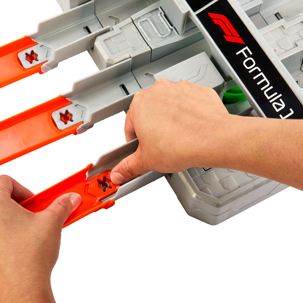 A szett tartalmaz három, valós Forma-1 csapat által inspirált 1:64 méretarányú kisautót is, például az Oracle Red Bull Racing, a MoneyGram Haas F1 Team és a Williams Racing dizájnjaival. A Speed Snap Track rendszernek köszönhetően a pálya könnyen összerakható és bővíthető más Hot Wheels elemekkel (külön kaphatók), így a gyerekek mindig új versenyélményeket alkothatnak.