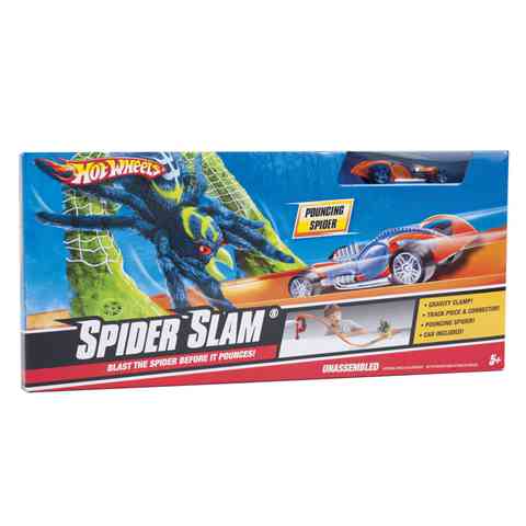 A pókok gyorsak, ügyesek és pontosak! Itt most neked is ezekre a tulajdonságaidra lesz szükség ahhoz, hogy elkaphasd ezt az óriás pókot, ami rád vadászik. Vigyázz, mert a pók fenn csüng a hatalmas kapun, ami alatt át kell száguldanod. Ha elég ügyes vagy, akkor el tudod őt találni a kocsiddal és már győztél is! A Spider Slam pálya kompatibilis az összes többi Hot Wheels pályával, így összeépítheted őket akár egy hatalmas szetté is. A pálya egy Hot Wheels kisautót is tartalmaz, hogy azonnal elkezdődhessen a játék!