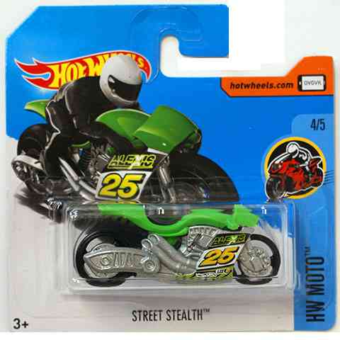 A Street Stealth egy igazán vagány sportmotor, ami már a méreg zöld színével felhívja az emberek figyelmét arra, hogy ez a járgány nem igen való avatatlan kezekbe. A többszáz lóerős motor a könnyű szerkezetnek köszönhetően pillanatok alatt képes akár 200 km/h felé gyorsulni, a végsebessége pedig meghaladja a 350 km/h-t. A Hot Wheels 1/64 méretű jármű modelljei a megszokott minőségére a részletgazdag kidolgozás, és kiváló minőségű festés a garancia, és éppen ezért minden ilyen kisautó a gyűjteményed előkelő darabja lesz.
