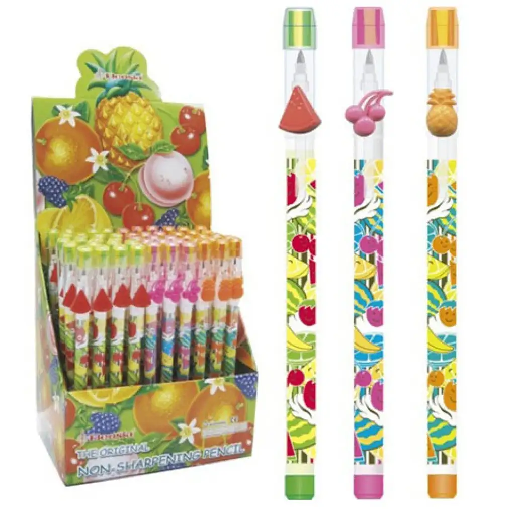Többféle színű grafitceruzát szerezhetsz most be gyermeked számára és mindezek külseje gyümölcsökkel van tele, hogy vonzóbbá tegye a kicsik számára, sőt kupakja egy radírral is fel van szerelve. Ezek nem akármilyen ceruzák, hanem tolóbetétes kialakítással rendelkeznek, ami azt jelenti, hogy nem kell többet hegyezőt használniuk. A tolóbetét segítségével mindig hegyes ceruzával dolgozhatnak a kicsik. Ha elkopott a fej, akkor csak annyi a teendő, hogy alulról ki kell húzni, és felül bedugni.
