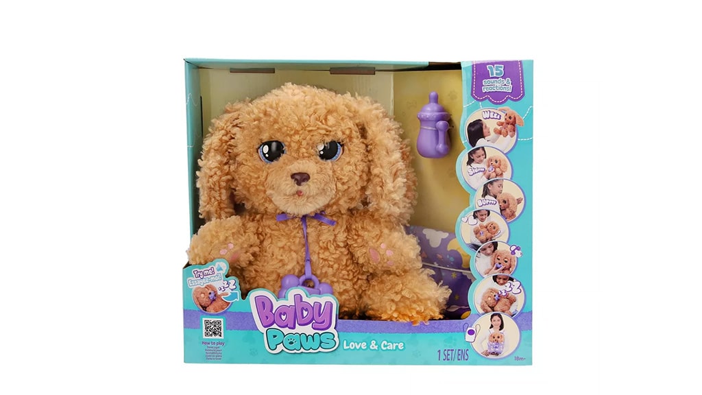 Ez a játék tiszteletet, felelősséget és gondoskodást tanít a valósághű játék révén. Tökéletes azoknak a gyerekeknek, akik kutyát szeretnének, és azoknak a szülőknek, akik nem szeretik a rendetlenséget! A játék kutya 15 különböző reakcióval és hanggal rendelkezik: ugat, csahol, böfög, szürcsöl, horkol, és úgy tűnik, mintha lélegezne, ahogy a pocakja fel-le mozog. A szülők letölthetik a Baby Paws alkalmazást is, és beírhatják gyermekük Baby Paws adatait egy szimulált állatorvosi látogatáshoz. A kicsik úgy érezhetik, mintha valóban egy új családi baráttal lépnének kapcsolatba, miközben simogatják, kiegészítőkkel látják el, és hallgatják!
