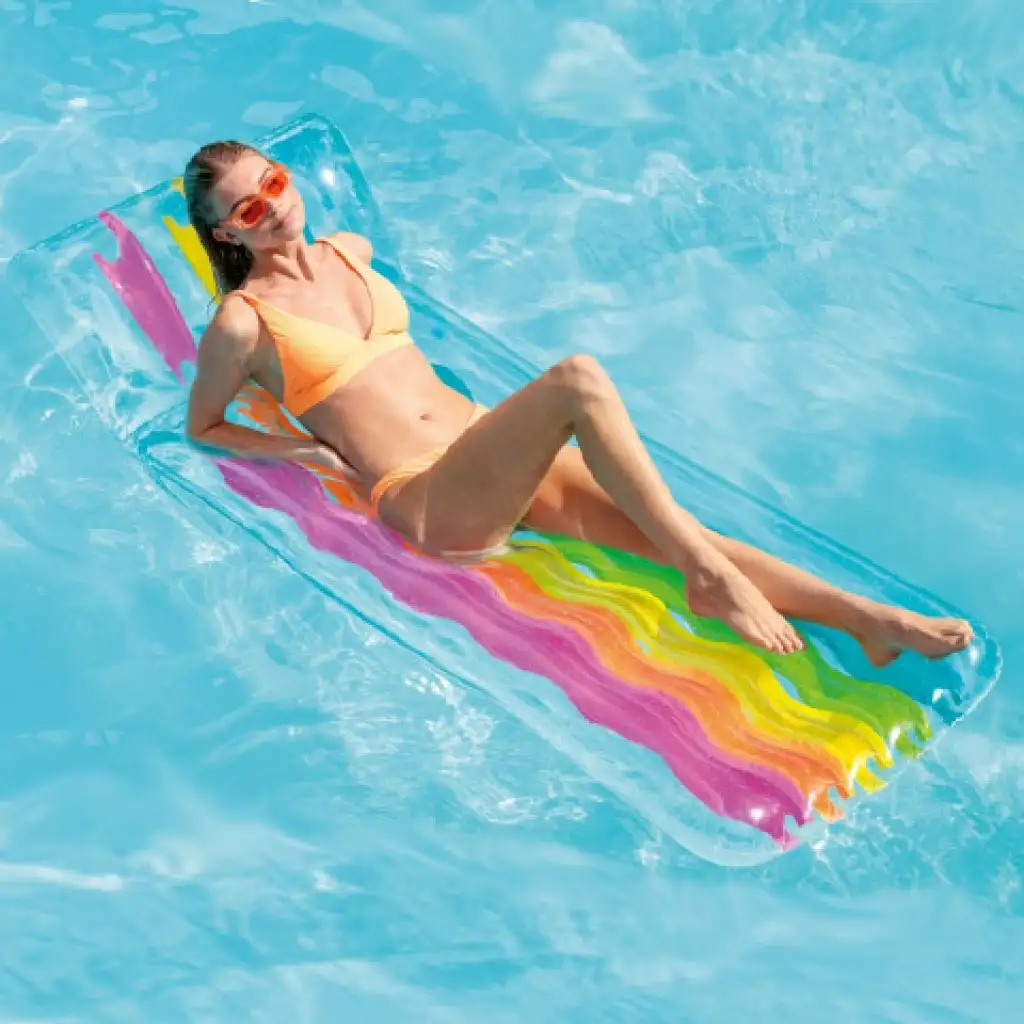 Fedezd fel a tökéletes pihenést és kikapcsolódást ezen a szuper úszómatracon! Ez a lenyűgöző felfújható nyugágy ideális választás a nyári napozáshoz és a vízben való lazításhoz. A matrac lenyűgöző átlátszó kialakítással rendelkezik, amely lehetővé teszi, hogy élvezze a víz hullámzását és a nap sugarait. Az egyedi szivárvány színek láthatóak a matrac belsejében, amely még különlegesebbé teszi a megjelenést. Az úszómatrac méretei (203x84 cm) elegendő teret biztosítanak a kényelmes fekvéshez. Az erős és tartós anyagból készült matrac biztonságos és megbízható társ a vízen. Könnyen felfújható és leereszthető, így könnyen szállítható és tárolható. Legyen az úszómedence, a tenger vagy a tavak, biztosan kellemes pihenést nyújt majd. Élvezd a napsütést és a vízben való lazítást ezzel a stílusos és kényelmes matraccal.