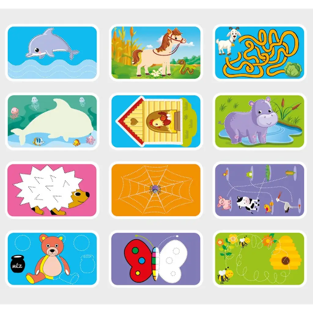 A csomag 12 kétoldalas kártyát tartalmaz, amelyek mindegyikén más-más állatos feladvány várja a gyerekeket. A feladatok között megtalálhatók vonalvezetési gyakorlatok, útvesztők, pontösszekötések és minták kiegészítése. A kártyák letörölhetőek, így a mellékelt filccel újra és újra megoldhatók a feladatok, biztosítva a folyamatos gyakorlás és tanulás lehetőségét.
