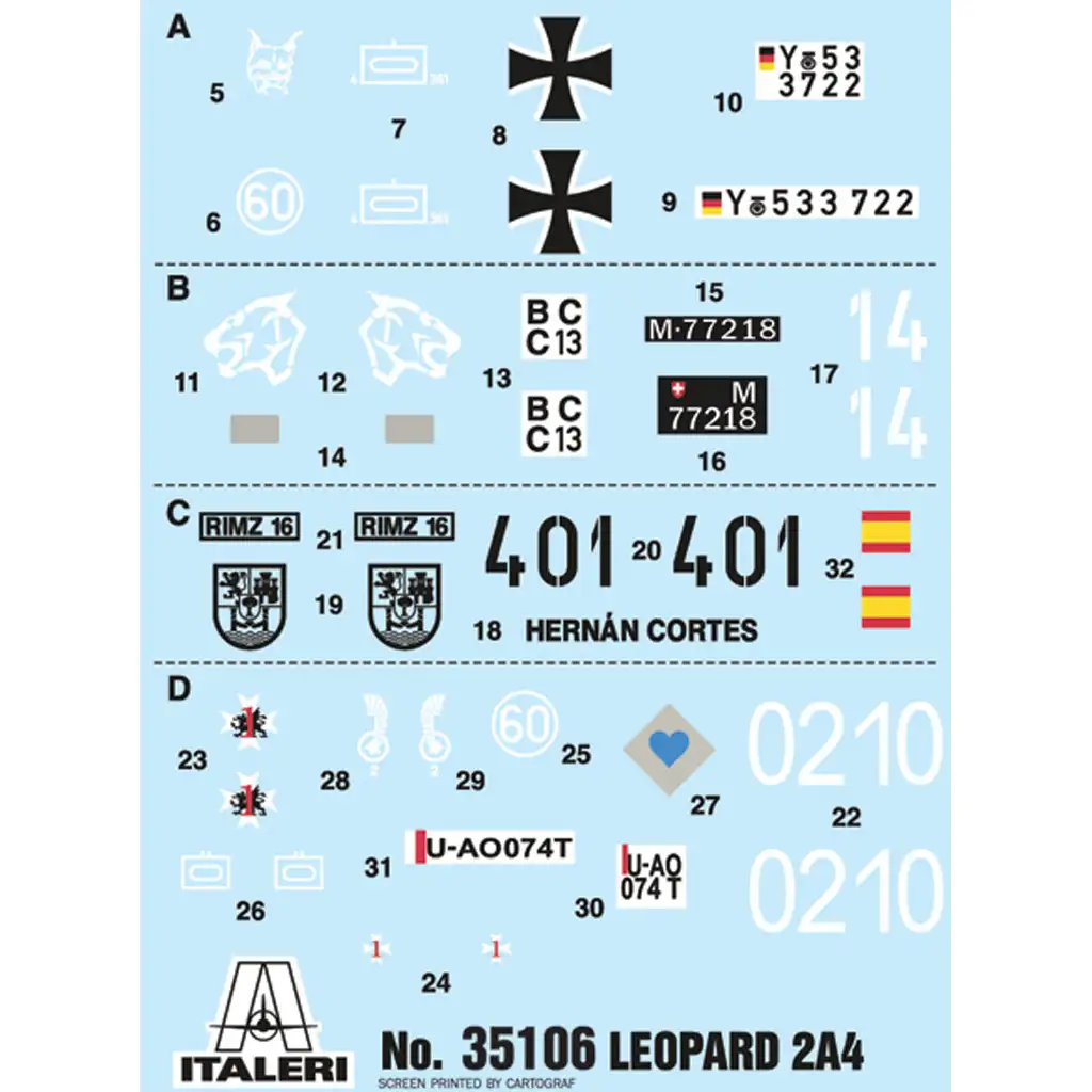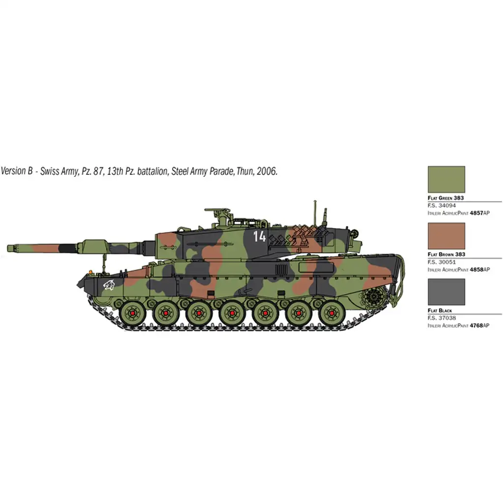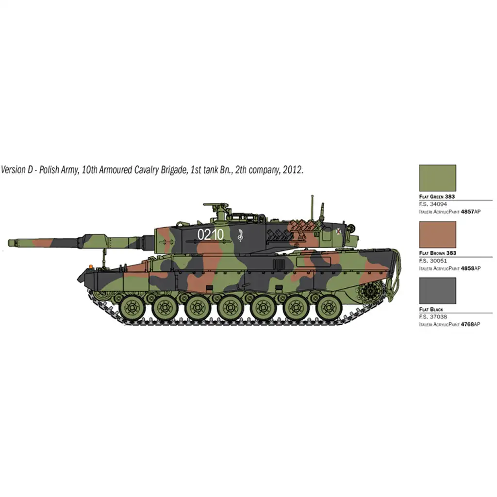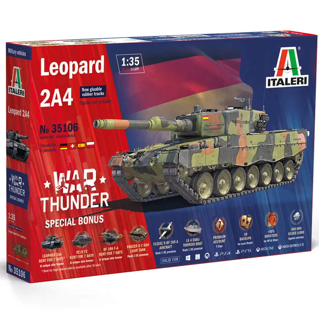 Ez a prémium minőségű 1:35 méretarányú Italeri makett részletgazdag kidolgozással és valósághű megjelenéssel rendelkezik. A csomag négyféle matricaszettet tartalmaz, amelyek lehetővé teszik különböző országok Leopard 2A4 változatainak megépítését. Az összeszerelés során a pontosan illeszkedő alkatrészek és az új típusú ragasztható gumi lánctalp biztosítja a könnyű és élvezetes építési folyamatot.