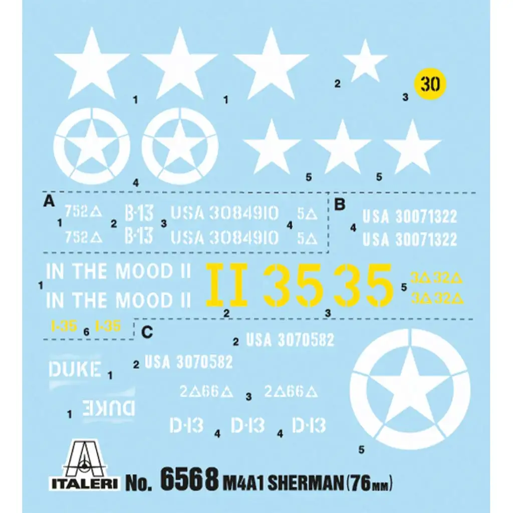 Az Italeri 1/35 méretarányú M4A1 Sherman makettje kiváló részletességgel készült, és tíz amerikai gyalogos figurát is tartalmaz, amelyek élethű diorámák készítésére is lehetőséget adnak. A készletben található ragasztható T54E1 lánctalpak élethű megjelenést biztosítanak, míg a háromféle választható jelölés révén több történelmi variáció is elkészíthető. Az aprólékosan kidolgozott torony, páncélzat és fegyverzet még hitelesebbé teszi a modellt.