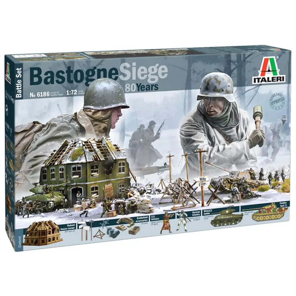 Ez az 1:72 méretarányú Italeri dioráma készlet kiváló minőségű figurákat, járműveket és tereptárgyakat tartalmaz, hogy megidézze a Bastogne körüli csaták hangulatát. A részletgazdag, festhető katonai figurák az amerikai és német csapatokat egyaránt ábrázolják, míg a romos épület, harckocsik és harctéri kiegészítők élethűen visszaadják a téli ostrom körülményeit. A készlet ideális egy teljes csatajelenet megépítéséhez, amely látványos megjelenést biztosít minden makettgyűjtő és történelmi diorámák iránt érdeklődő számára.