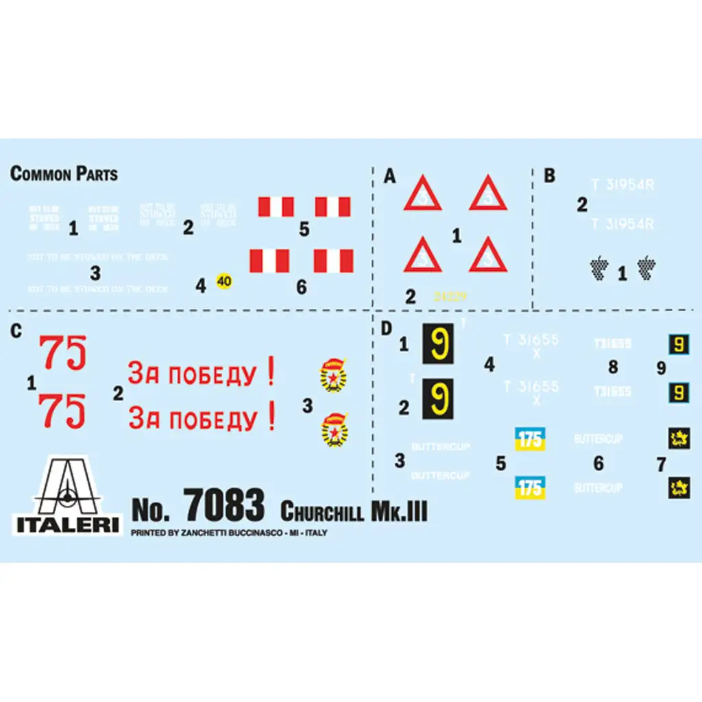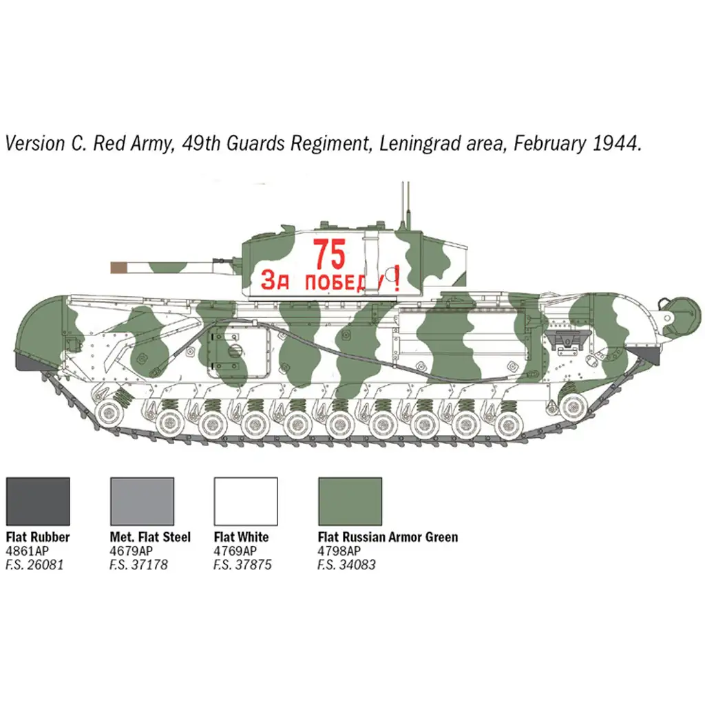 Ez az Italeri 1:72 méretarányú Churchill Mk. III makettje részletgazdag és pontos mása az eredeti tanknak. A készlet finoman kidolgozott elemekkel rendelkezik, beleértve a ragasztható lánctalpat és a harcjármű jellegzetes páncélzatát. A csomag tartalmaz egy figurát, amely tovább fokozza a makett élethűségét, valamint négyféle matricázási lehetőséget, lehetővé téve különböző brit és szövetséges alakulatok megjelenítését.
