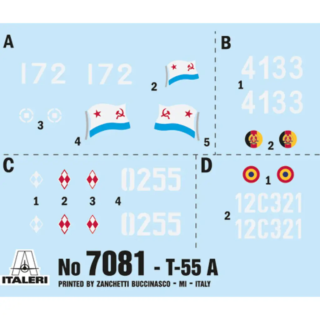 Ez az Italeri 1:72 méretarányú T-55A makettje kiváló minőségű és részletgazdag kivitelezésével hűen visszaadja az eredeti jármű jellegzetességeit. A készlet finoman kidolgozott külső és belső elemeket tartalmaz, beleértve a teljesen részletezett motort is. A tank toronyforgatási lehetőséggel és élethű lánctalp kialakítással rendelkezik, így realisztikus megjelenést biztosít. A csomagban négy különböző matricaopció található, lehetővé téve több nemzet színeiben való elkészítését.