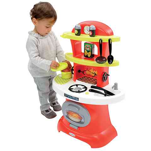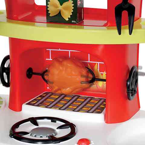 Ez a gyerekkonyha az élénk színeivel és kerek formáival minden gyerekszobában garantáltan jól fog mutatni. A konyha középső részén egy nagy kemence kapott helyet, ami egy roppant gusztusos csirkét sütögethetünk aranybarnára. Persze a pulton olyan nélkülözhetetlen konyhai dolgok is helyet kaptak, mint a csaptelep a mosogatóval, és a gáztűzhely. A játékkonyhához egy tucatnyi kiegészítő is tartozik, edények, játékételek, és még egyéb konyhai eszközök. Egyszóval minden biztosítva van, hogy egy kis kukta hosszan eljátsszon vele.
