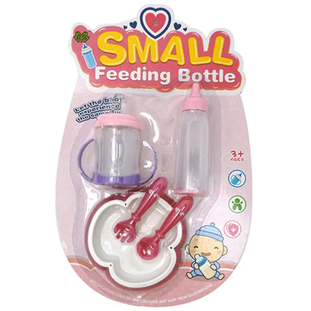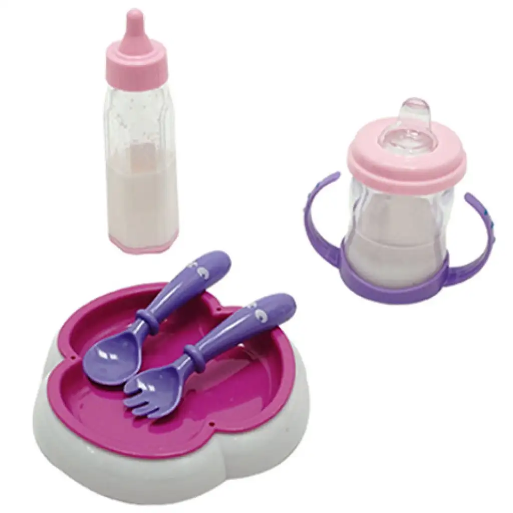 Gyermeked játékbabáinak számára ezúttal egy kiváló minőségű etető készletet szerezhetsz be amelynek segítségével egy szempillantás alatt megetetheti kedvenc játékbabáját. A szettben két különböző féle cumisüveget, tányért és evőeszközt is találhatsz amelyek segítségével változatosan etetheti meg gyermeked kedvenc babáját. A szett 100%-ban káros anyag mentes műanyagból készült evőeszközöket tartalmaz amelyek akár mosogatógépben is moshatók.
