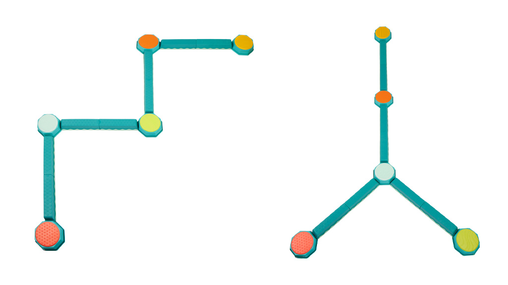 A B-Toys Egyensúlyozó és építő szett tartalmaz öt érzékelő lépőkövet és nyolc gerendát. A szülők és a gyerekek különböző akadályokat hozhatnak létre, amelyeken át lehet sétálni. Az építők a gerendákat úgy kapcsolják össze, hogy a nyomtatott mosolygós arcokat igazítják és összekattintják őket — a gyerekek könnyen követhetik ezeket a mintákat, hogy új egyensúly pályákat készítsenek.