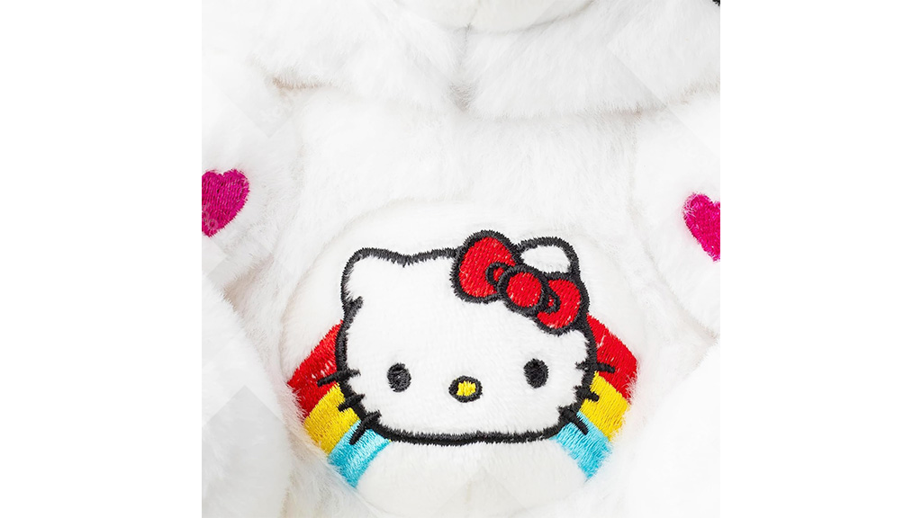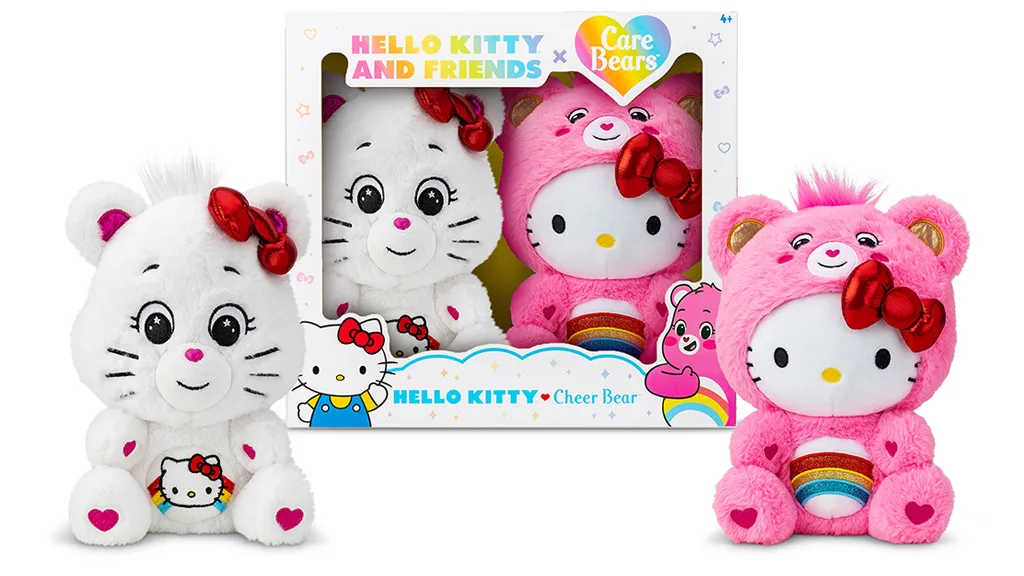 Ez a Hello Kitty Loves Cheer Bear szett a Basic Fun-tól két 10 hüvelykes, puha, ölelhető plüssfigurával érkezik, amelyeket 4 éves és annál idősebb gyerekek számára terveztek. Hello Kitty és barátai csatlakoztak a Care Bears-hez a Care-a-Lot földjén, hogy együtt terjesszék a pozitivitást és a kedvességet. Cheer Bear fehérbe van öltözve, mint Hello Kitty, a jellegzetes piros masnival és bajusszal. Szivárványos hasjelvénye egy Kitty képpel van díszítve, míg Hello Kitty egy rózsaszín Cheer Bear jelmezben van!