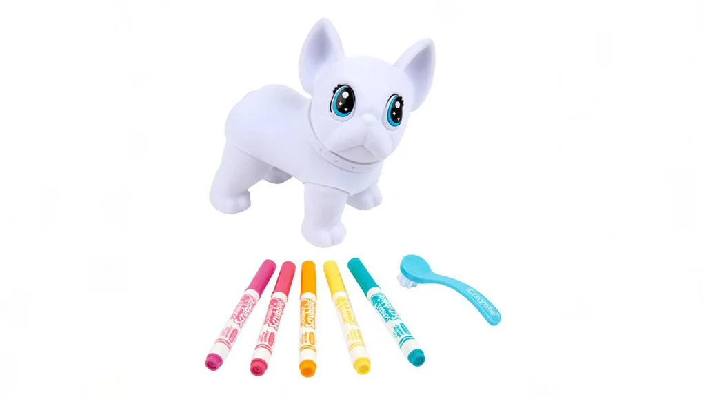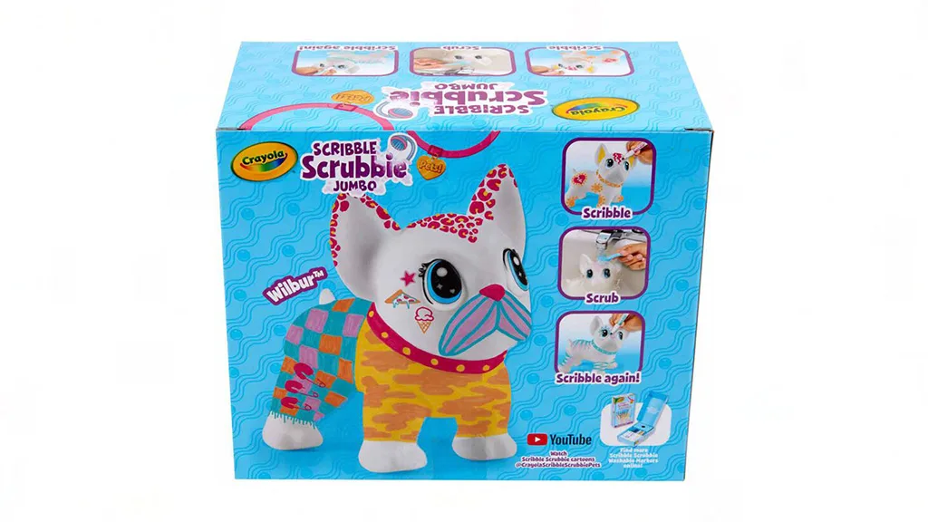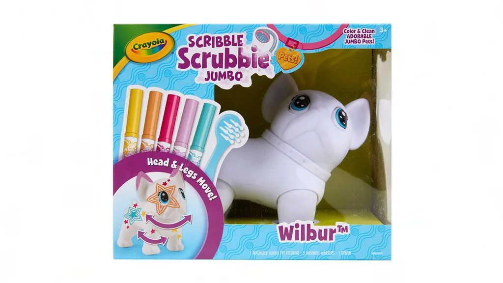 Crayola új méretben hozza el a Scribble Scrubbie játékot ezzel a óriásméretű francia bulldoggal. Wilbur egy speciális tisztítókefével és öt nem mérgező markerrel érkezik élénk színekben: rózsaszín, narancs, sárga, lila és kék. Körülbelül 15 cm magas és 7,5 cm széles, ez a Scribble Scrubbie kutya bőven nyújt felületet a gyerekek alkotásainak, ráadásul mozgatható fejjel és lábakkal rendelkezik, így bármilyen pózt felvehet. A gyerekek rajzolhatnak markerrel ruhákat, mintákat készíthetnek, vagy történetet írhatnak a szőrére. Amikor készen állnak egy friss palettára, mossák le vízzel és nézzék, ahogy a színek eltűnnek!