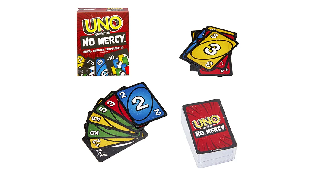 UNO - Nincs kegyelem! egy könyörtelen csavar a világ kedvenc játékán, az UNO-n. Ez a változat 56 új kártyát és különleges szabályokat ad a játékmenethez. A játékosok keményebb akciókártyákat találnak, mint a Mindenki kihagyása és a 10 lap húzása.