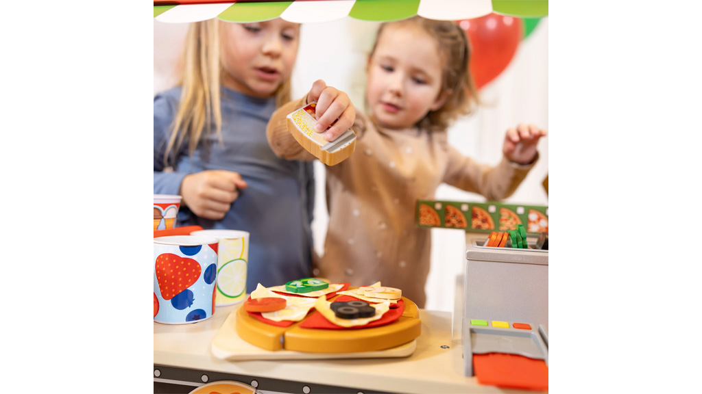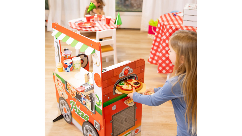 A gyerekek elkészíthetik a saját képzeletbeli pizzájukat a mellékelt sütőben, fa pizzaszeletekkel és filc feltétekkel, mint például sajt, gomba és még sok más. A pizzás kocsi egyben fagylaltos kocsiként is funkcionál, fa fagylaltgombócokkal, egy tölcsérrel, egy fagylaltkanállal és egy csészével.