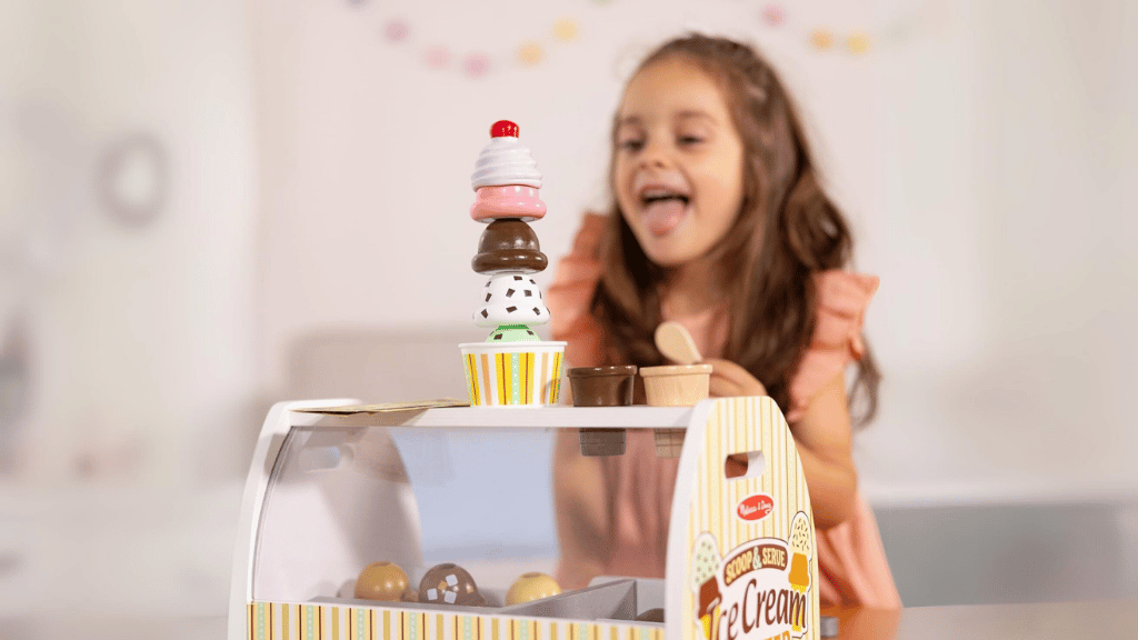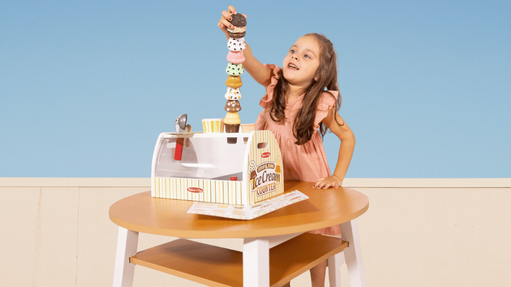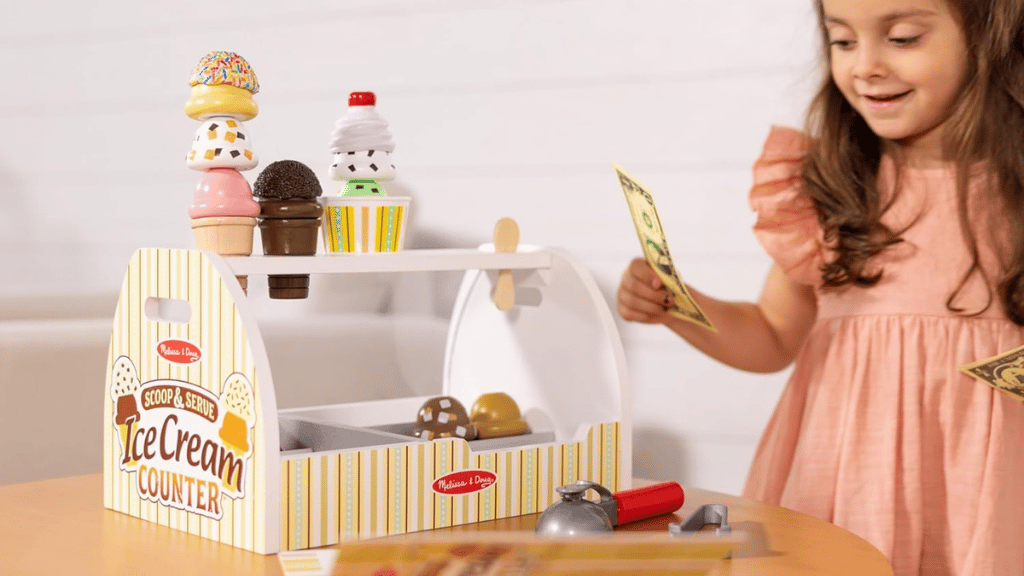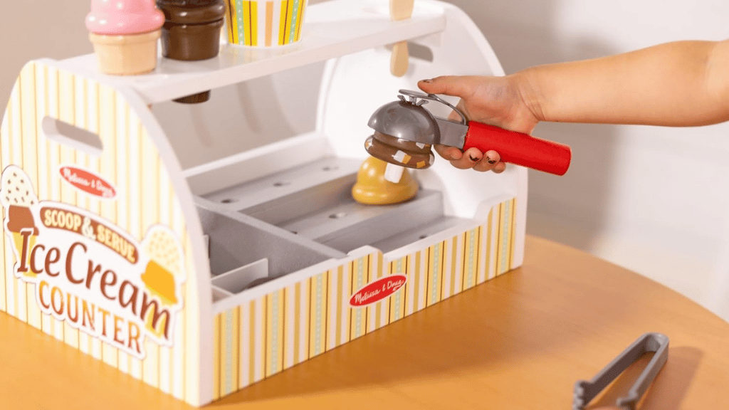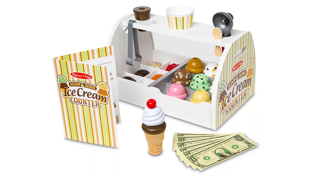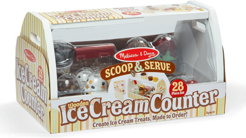 Merülj el az édes szerepjáték világában a Melissa & Doug Scoop and Serve Ice Cream Counter segítségével! Ez a bájos készlet egy masszív, fából készült asztali pultot tartalmaz, amely mindennel fel van szerelve, amire a gyerekeknek szükségük van saját fagylaltboltjuk működtetéséhez. Nyolc különböző ízű fagylaltgombóctól kezdve a feltéteken, tölcséreken és kiszolgáló eszközökön át, ez a készlet ösztönzi a kreativitást és a társas játékot. A kicsik felvehetik a rendeléseket az újrahasználható menükártyán, gombócolhatják és rétegezhetik a fagylaltot, valamint felfedezhetik a képzeletbeli szerepjáték szcenáriókat.