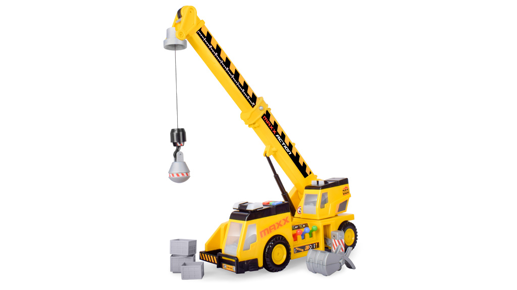 A gyerekek emelhetik, mozgathatják és összetörhetik az építőkockákat három joystick vezérlő segítségével! A 27 hüvelykes darunak három tartozéka van — egy kanál, egy horog és egy rombológolyó —, valamint villogó fények és valósághű hangok. Egy gombnyomással a daru előre vagy hátra mozog.