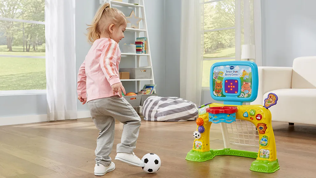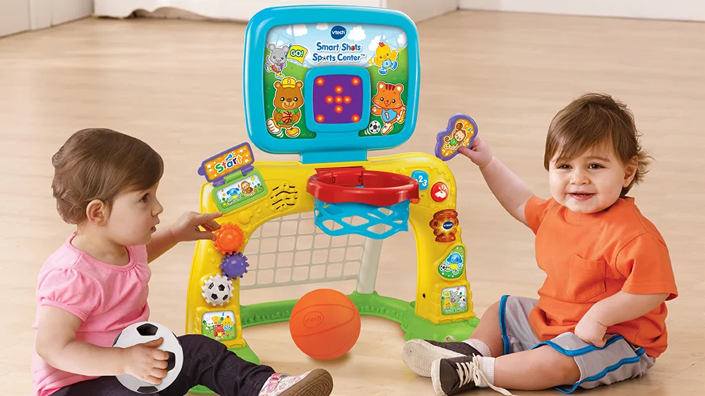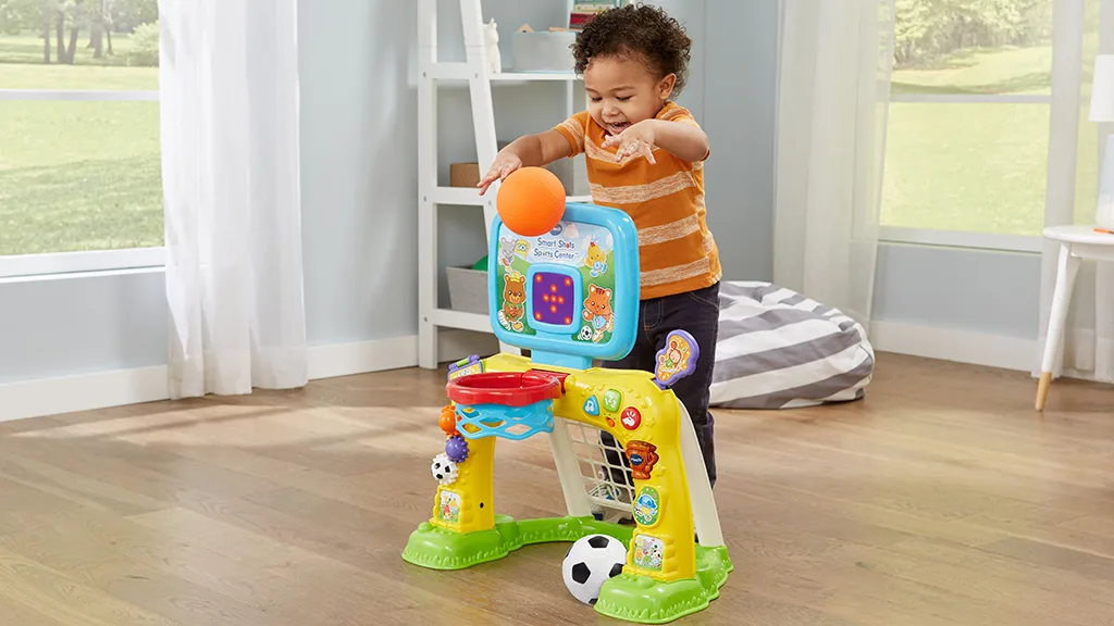 Ez a VTech által készített elektronikus sportközpont játékkészlet egy focikaput és egy kosárlabdapalánkot tartalmaz a kis sportrajongóknak. A gyerekek bedobhatják a kosárlabdát a palánkba és nézhetik, ahogy az LED kijelző számolja a kosarakat, vagy belőhetik a labdát a kapuba és hallhatják, ahogy a központ bátorító hangokkal és mondatokkal válaszol. Az LED kijelző nem csak a kosarakat számolja, hanem bátorítja a gyerekeket az aktív játékra szórakoztató animációkkal. Emellett fogaskerekek is vannak, amiket a gyerekek tekergethetnek, és gombokat nyomogathatnak, hogy megtanulják a számokat, színeket, formákat és még sok mást.
