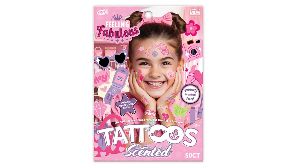 Ez az 50 darabos, vattacukor illatú, bőrbarát, ideiglenes tetoválás csomag használható a bőrön, ruházaton, vizes palackokon és még sok más felületen, hogy a gyerekek élvezhessék. A csomag tartalmaz egy "Tippek és Trükkök" útmutatót is, hogy a szórakozás maximális legyen.