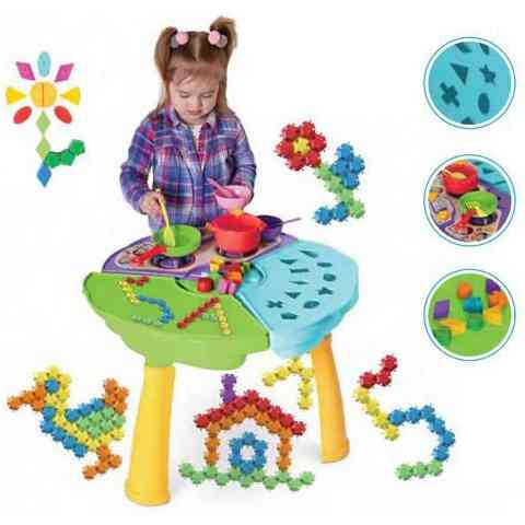 A 3 az 1-ben készségfejlesztő asztalka felületén három különböző játék is elérhető amelyekkel gyermeked játékosan fejlesztheti a kézügyességét és korlátlan lehetőségei vannak a fejlődésre. Az asztalka három szeletre lett osztva amelyek között egy kis konyha is található összesen 12db kiegészítővel együtt, serpenyővel, evőeszközökkel és tányérral. A formaillesztő szeletben összesen 10 különböző színű és formájú alakzatot kell behelyeznie a megfelelő lyukba amely a kézügyességét és a logikáját is fejleszti. A kis asztal harmadik szelete a puzzle blokkok elhelyezésére szolgál, itt összesen 40 alkotóelemet találhatsz különböző színben és formában amelyekből bármit megalkothat, de a felület akár rajzolásra is kiváló lehetőséget nyújt.