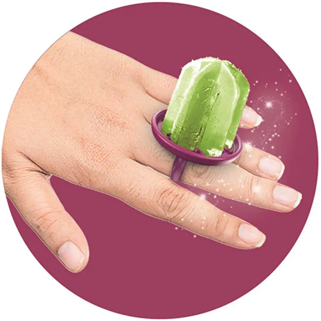 Minden kislány jól ismeri a Jégvarázs mesefilmet és a benne szereplő két meseszép hercegnőt Elzát és Annát, és mindenki tudja, hogy Elza varázslatos erejével havat és jeget tud teremteni. Bár ilyen szuper képességet ez a játékkészlet sem ad senkinek, azonban néhány mókás és finom jégkrémet könnyedén készíthetnek vele a kicsik. nincs is más tenni való, mint az élénk színű és ízesített folyadékkal feltölteni a tartót, és a gyűrűket vagy a pálcát beleilleszti, majd mehet be a fagyasztóba. Amint megfagyott, a kislányok a kezükre húzhatják a gyűrűt, aminek a tetején máris egy finom jégkrémet lehet nyalogatni.