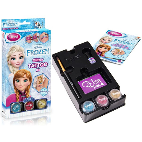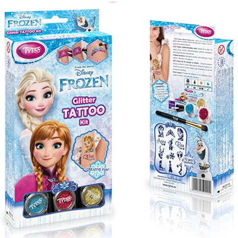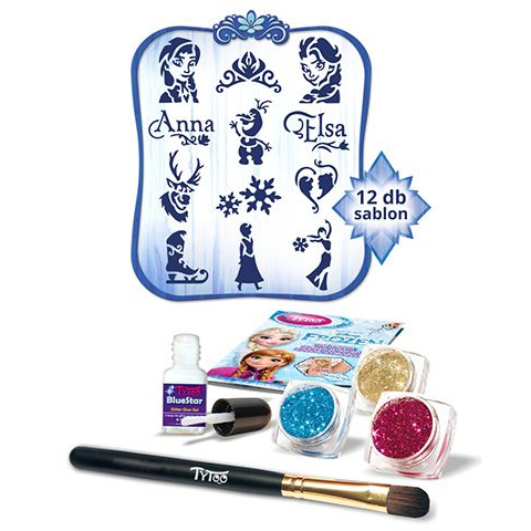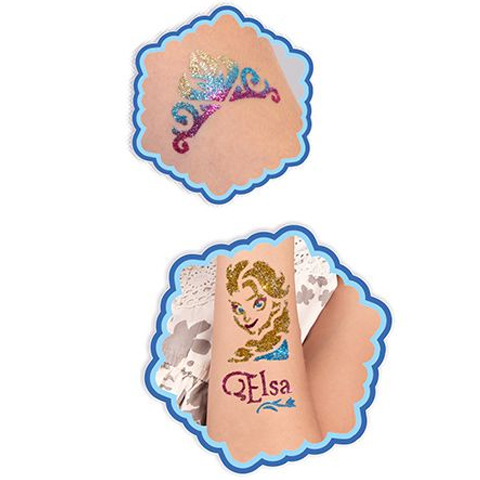 A Jégvarázs Disney mese jéghercegnői, Elza és Anna ezúttal egy menő csillámtetoválás keretein belül érkezhetnek hozzád és segítségükkel divatossá varázsolhatod magad vagy kedvenc használati tárgyad egy szempillantás alatt. A szettben három különböző színű csillámport találhatsz amellyel dekorálhatod a kiválasztott sablon által felvitt mintát a bőrödre. Válassz a 12 féle minta közül, helyezd fel a bőrödre vagy bármely más tárgyra és a szettben található ragasztó segítségével ecseteld végig a sablon belső területét, majd hordd fel a csillámport. Az elkészült tetoválás vízálló és akár 18 napon keresztül díszítheti bőröd. Dekorálj kedvenc Disney hercegnőidre jellemző mintákkal és hordd büszkén saját készítésű csillám tetoválásod. A tetoválásod babaolajjal könnyedén eltávolítható.