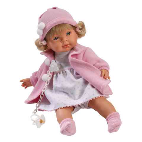 A kislány baba ruhájának színvilága a klasszikus baba rózsaszínre épül, melyet minden kislány kedvel. A pöttyökkel díszített ruhának játékosságát fokozza, hogy komoly szabású, egyszínű rózsaszín galléros kabátja pom-pommal díszített, ahogyan sapkája is. A síró babának tartozéka egy cumilánccal rendelkező cumi is, mely arra, szolgál, hogy megszüntesse a síró hangot, amit a baba textil testében elhelyezett szerkezet ad. A baba végtagjai és részletekben gazdag feje puha, gyermekbarát műanyagból készült. Ideális választás ez a játék azoknak a gyermekeknek, akik igénylik az esztétikus játékot.