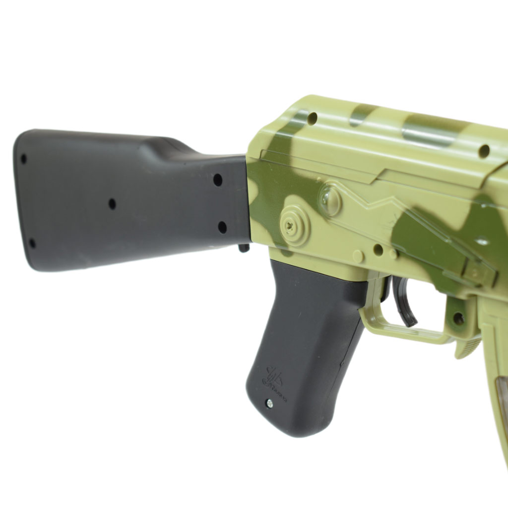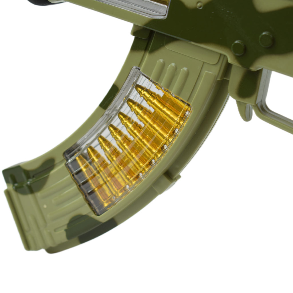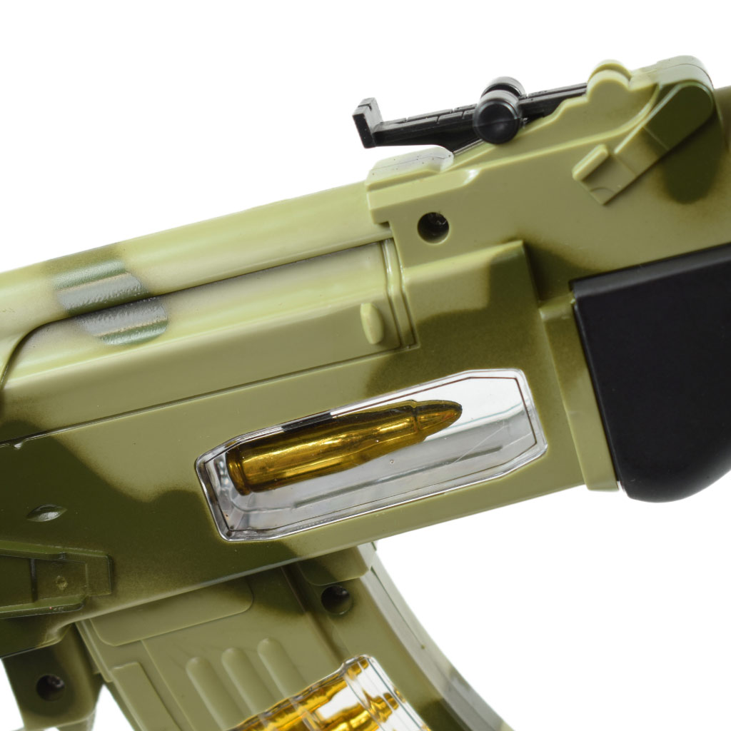 Egy lenyűgözően valósághű fegyverrel lepheted meg gyermekedet, hogy belecsöppenhessen egy képzeletbeli csatába és izgalmas harcokat vívjon barátaival. A fegyver rendkívül részletgazdag kialakítást kapott, melyet egy terepmintás mintázat tesz még autentikusabbá. A fegyver dupla tárat tartalmaz, amelyekben élethűen kidolgozott töltények sorakoznak. Ezáltal gyermeked teljes mértékben beleélheti magát a harci jelenetekbe. A fegyver kényelmesen vállhoz támasztható, így biztosítva a stabilitást a játék során. A ravaszt meghúzva fényeffektek kerülnek aktiválásra, amelyek segítségével a célpontot megvilágíthatja, valamint a tárat is világító funkcióval látták el, ami különleges vizuális élményt nyújt. Emellett a fegyver hangot is ad, és a tárban lévő töltények, valamint a fegyver csöve is mozog, ami tovább fokozza az élethűséget és a játékélményt.