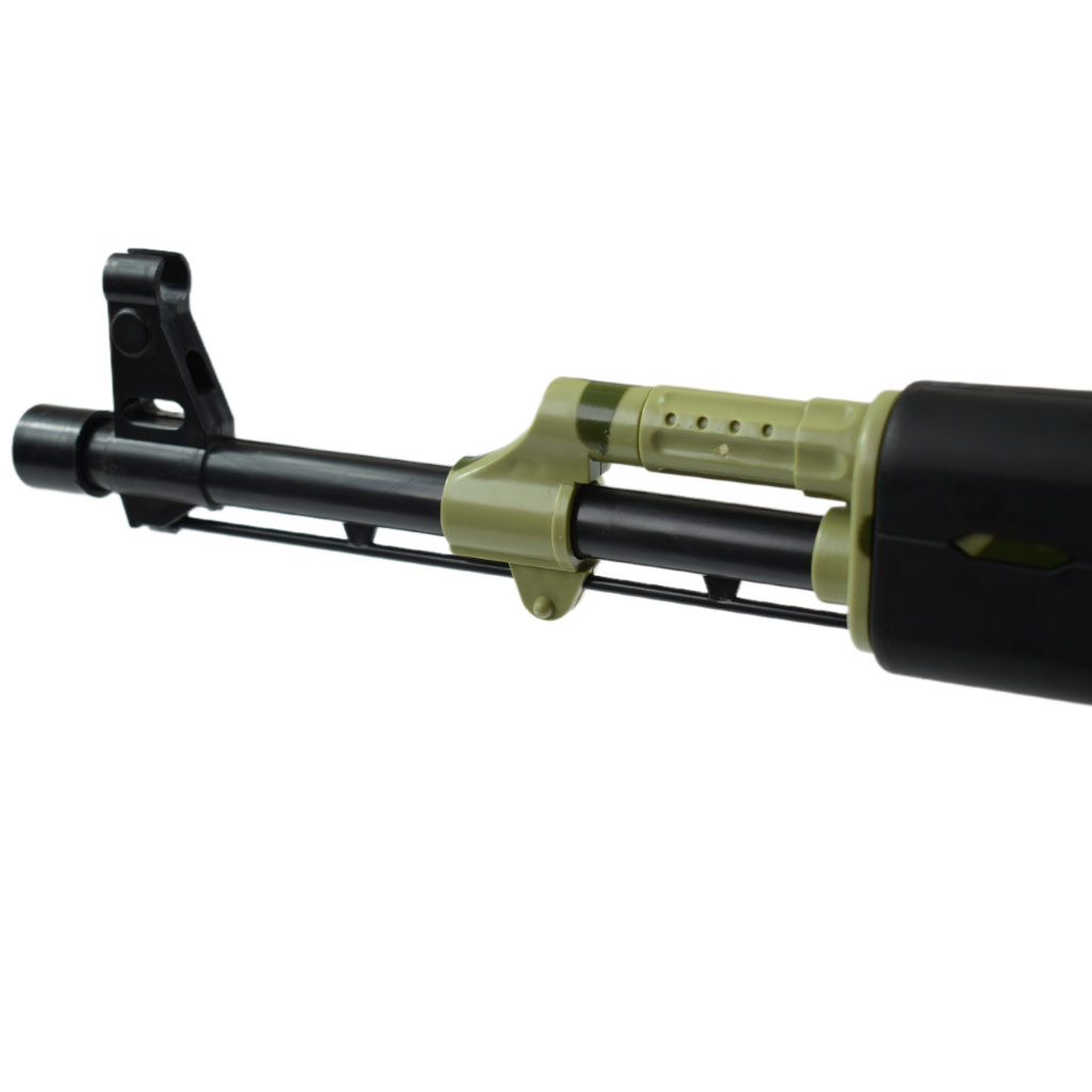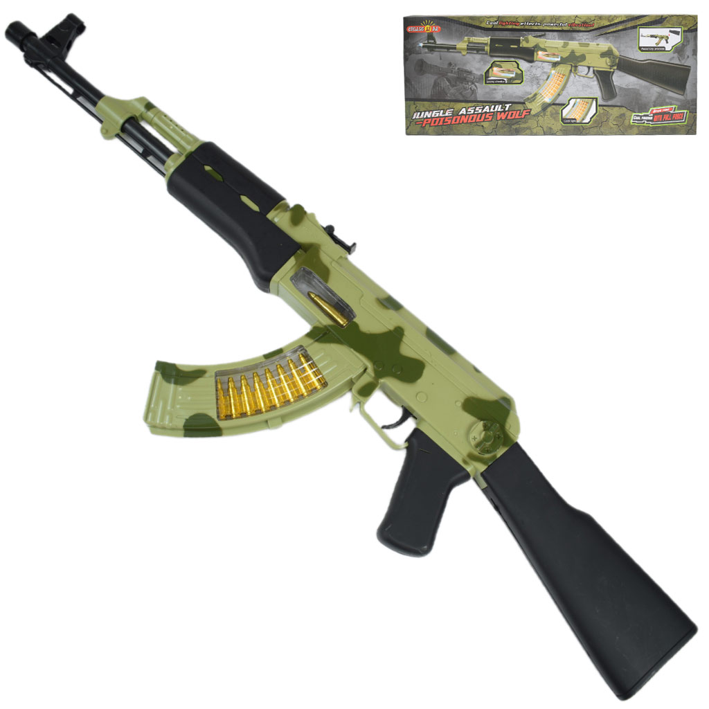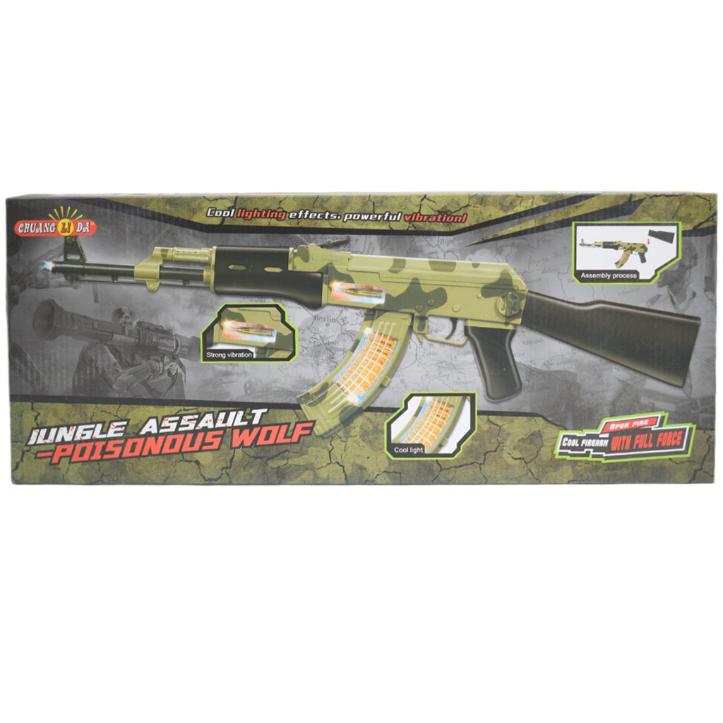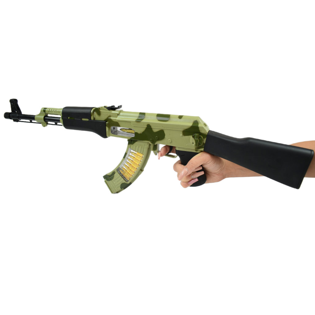 Egy lenyűgözően valósághű fegyverrel lepheted meg gyermekedet, hogy belecsöppenhessen egy képzeletbeli csatába és izgalmas harcokat vívjon barátaival. A fegyver rendkívül részletgazdag kialakítást kapott, melyet egy terepmintás mintázat tesz még autentikusabbá. A fegyver dupla tárat tartalmaz, amelyekben élethűen kidolgozott töltények sorakoznak. Ezáltal gyermeked teljes mértékben beleélheti magát a harci jelenetekbe. A fegyver kényelmesen vállhoz támasztható, így biztosítva a stabilitást a játék során. A ravaszt meghúzva fényeffektek kerülnek aktiválásra, amelyek segítségével a célpontot megvilágíthatja, valamint a tárat is világító funkcióval látták el, ami különleges vizuális élményt nyújt. Emellett a fegyver hangot is ad, és a tárban lévő töltények, valamint a fegyver csöve is mozog, ami tovább fokozza az élethűséget és a játékélményt.
