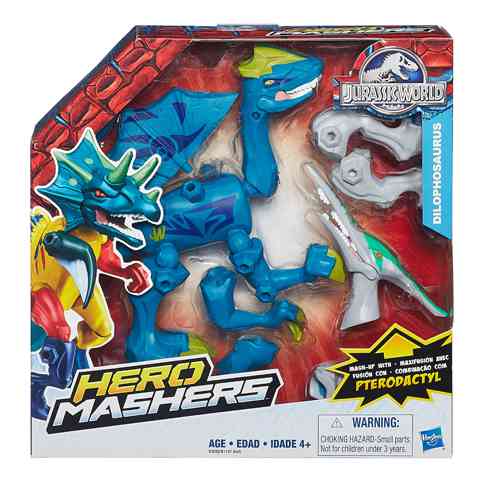 A Jurassic World filmben egy olyan szórakoztató parkot láthattunk, amelyben a rég kihalt dinoszauruszokat klónozássegítségével újra életre keltettek, és egy hatalmas szigeten kialakított állatkertben mutogatták őket az embereknek. Azonban néhány ragadozó dinoszaurusz megszökik, és kezdetét veszi a káosz. A fejetlenségben néhány Dilophosaurus is elszabadult, és rettegésben tartják az embereket. A Hasbro Hero Mashers játékainak a lényege, hogy a figurák végtagjai és a feje átcserélhető másik figurával, így ebben a sorozatban érdekes és izgalmas dinoszauruszokat állíthatunk össze magunknak.
