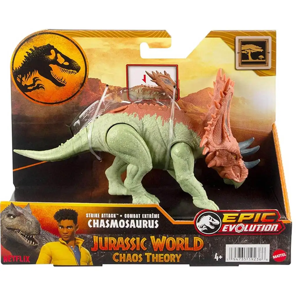 A figura interaktív funkcióval is rendelkezik: a hátán található gomb megnyomásával beindítható a „Strike Attack” támadó mozdulat, amely igazán izgalmas játékélményt nyújt. Ez a funkció lehetővé teszi, hogy a gyerekek eljátsszák a Jurassic World világának legizgalmasabb jeleneteit. A Chasmosaurus mozgatható végtagokkal is rendelkezik, így még többféleképpen állítható, és bármilyen akcióhoz alkalmazkodik.